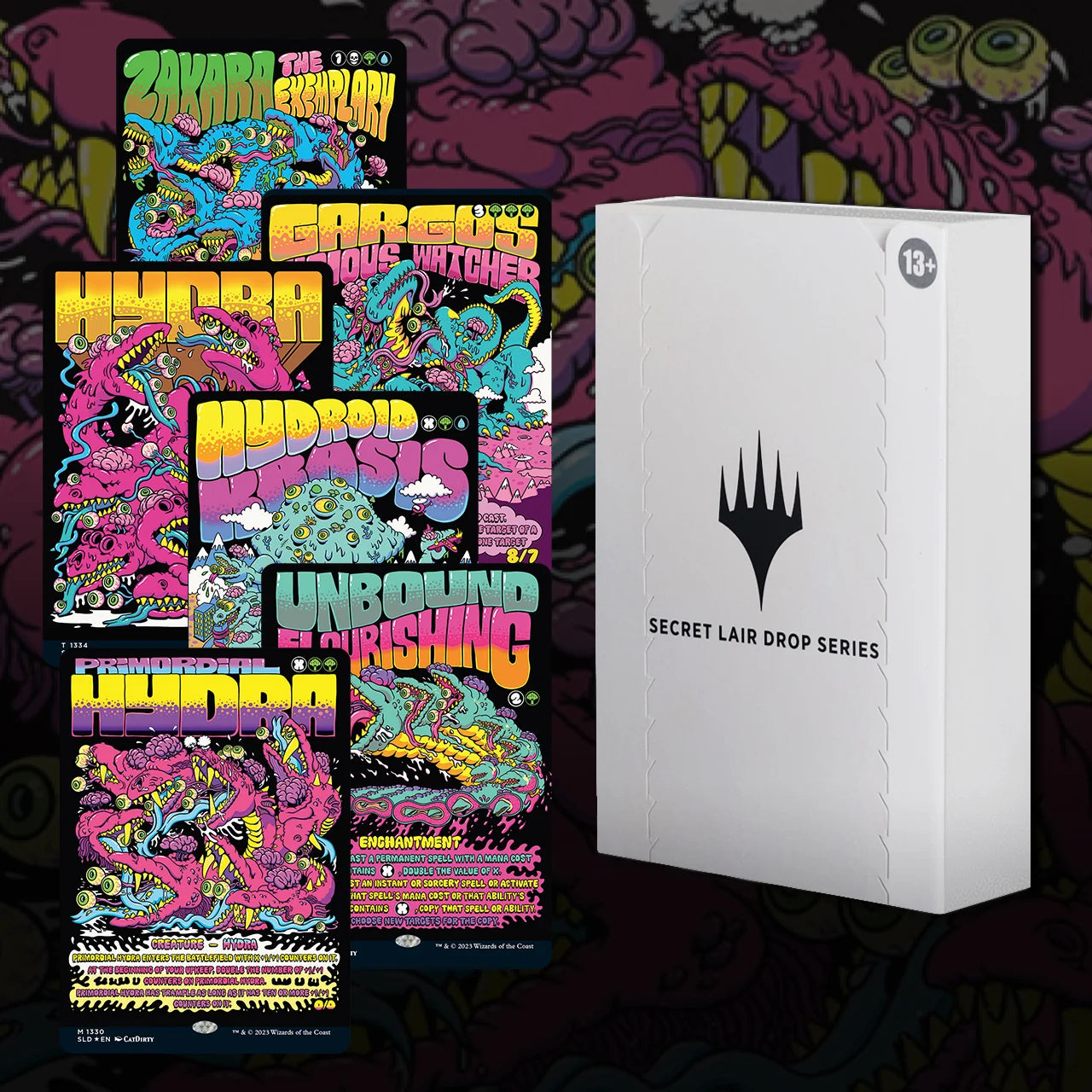 Every card in this product features expressive, eye-popping art by CatDirty that is sure to stun the table as they come into play. Share the contents across your social media platforms to capture players' interest in this edition of Magic's best worst-kept secret, available only at WPN stores.